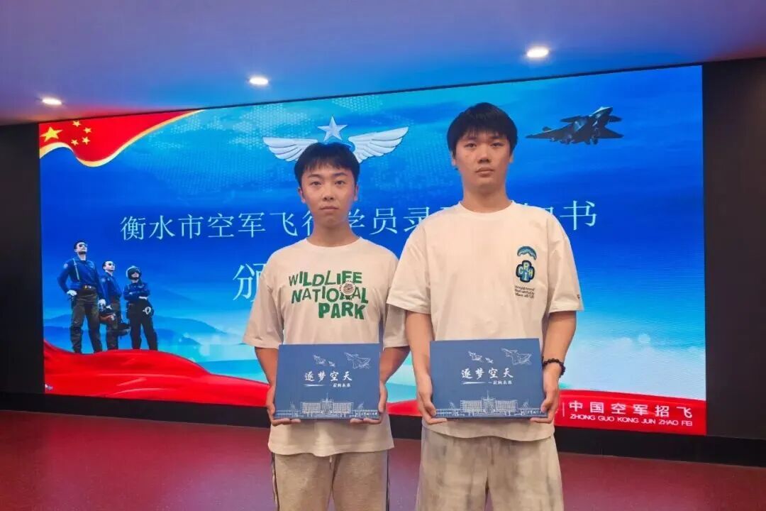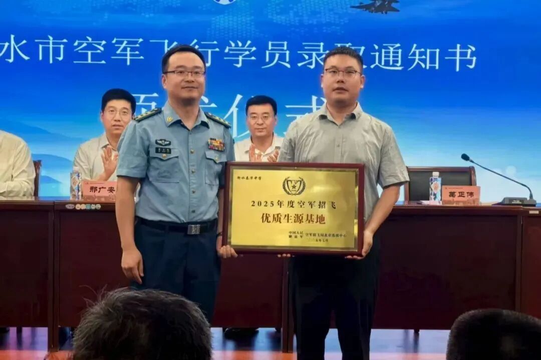 据悉,在今年7月份刚结束的2025年度空军招飞选拔中,我校谢栋江、徐王东山两位同学凭借过硬的综合素质脱颖而出,成功被录取为空军飞行学员!空军招飞局北京选拔中心特授予我校 “空军招飞优质生源基地” 牌匾。这份沉甸甸的荣誉,是对我校立德树人成果的充分肯定,也为在场学子树立了触手可及的榜样。