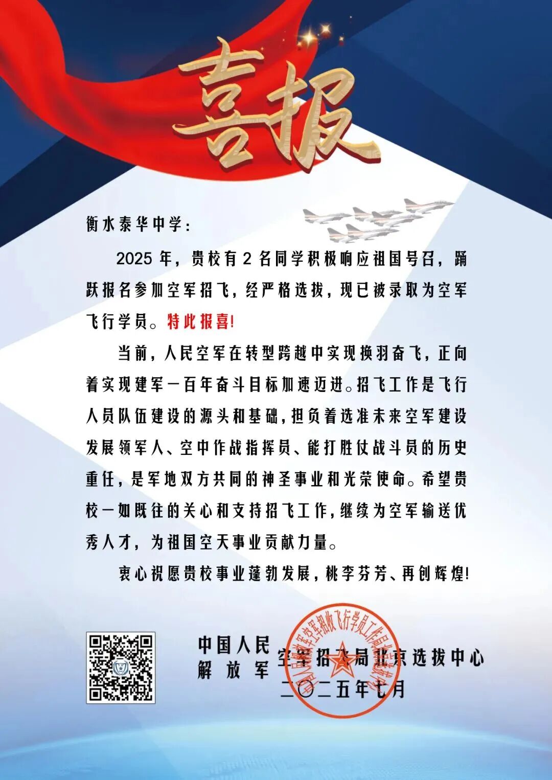 衡水泰华中学将继续秉持“为党育人、为国育才”的使命,不断提升教育教学质量,为有志于空天事业的学子搭建通往梦想的桥梁,鼓励更多优秀青年矢志空天,为强军强国事业贡献泰华力量!