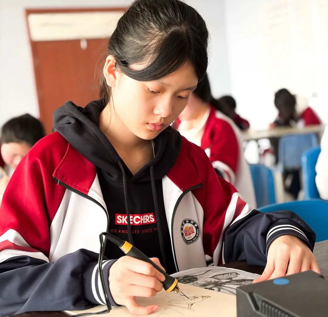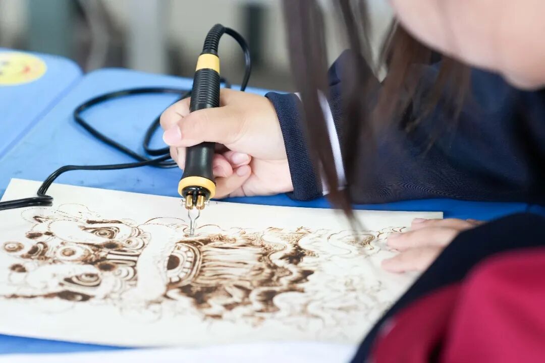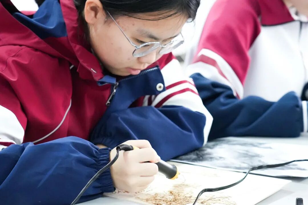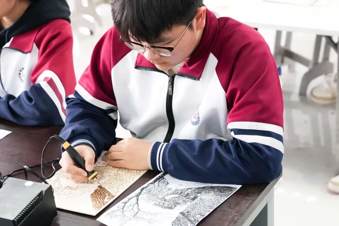 烙画,古称“火针刺绣”,是以烙铁为笔、高温为墨,在木板、宣纸、丝绸等材料上熨烫出深浅不一痕迹的绘画艺术。这项起源于西汉的技艺,如今正通过我校特色课程,与当代高中生展开一场跨越时空的对话。当这一古老的非遗技艺呈现在学生们面前,它带来的不仅是一门手艺,更是一扇窗,让学生们看见中华美学的深邃与温度。