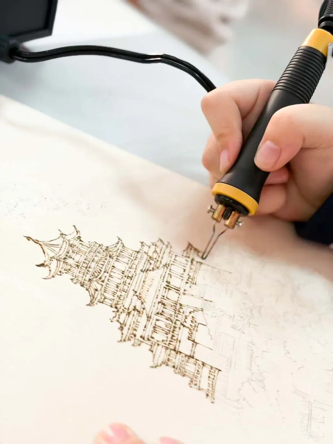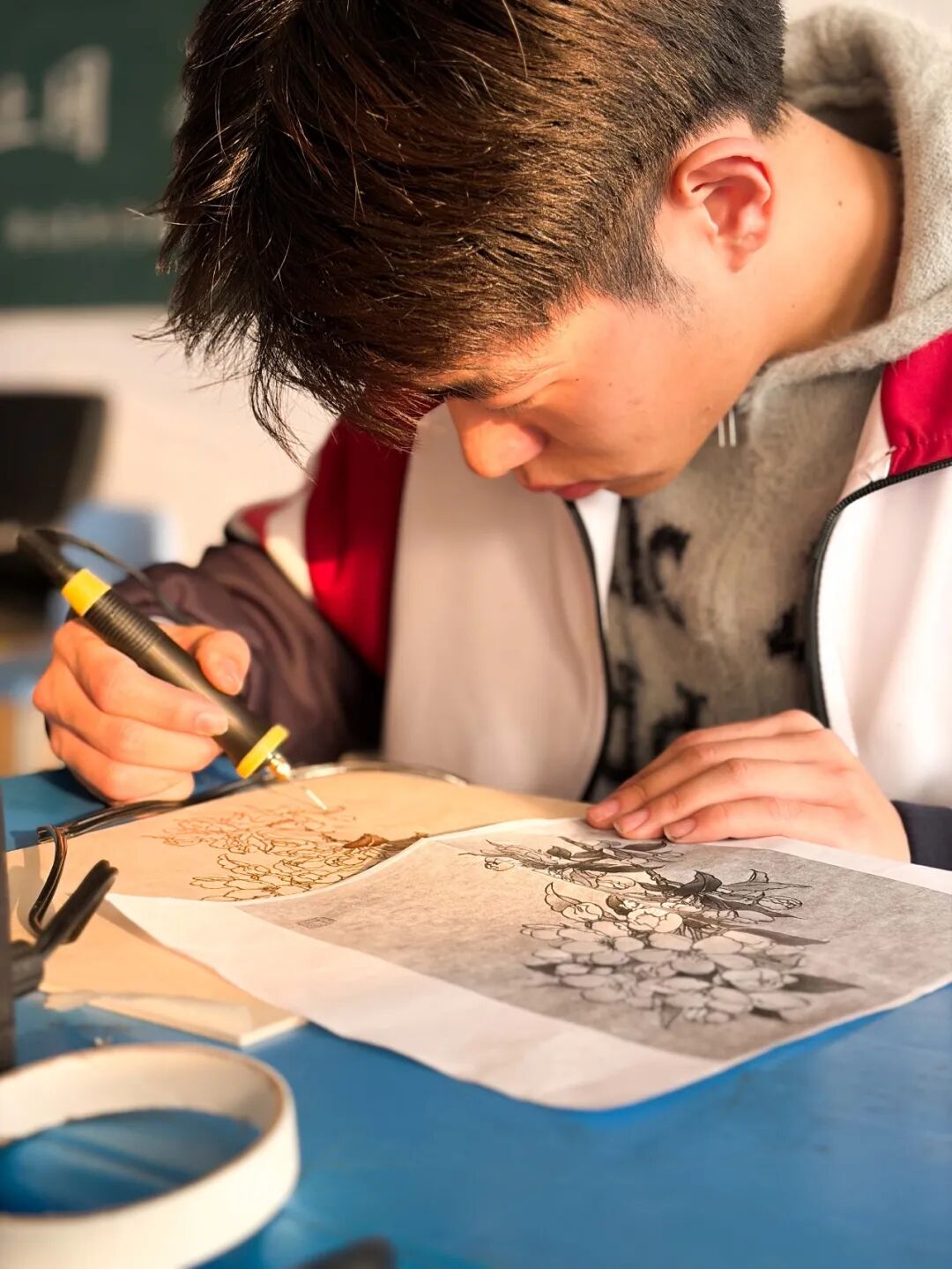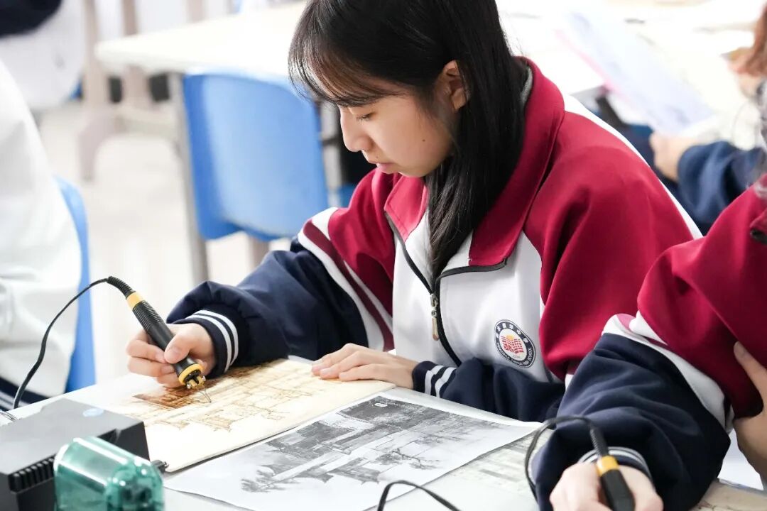 烙画,古称“火针刺绣”,是以烙铁为笔、高温为墨,在木板、宣纸、丝绸等材料上熨烫出深浅不一痕迹的绘画艺术。这项起源于西汉的技艺,如今正通过我校特色课程,与当代高中生展开一场跨越时空的对话。当这一古老的非遗技艺呈现在学生们面前,它带来的不仅是一门手艺,更是一扇窗,让学生们看见中华美学的深邃与温度。