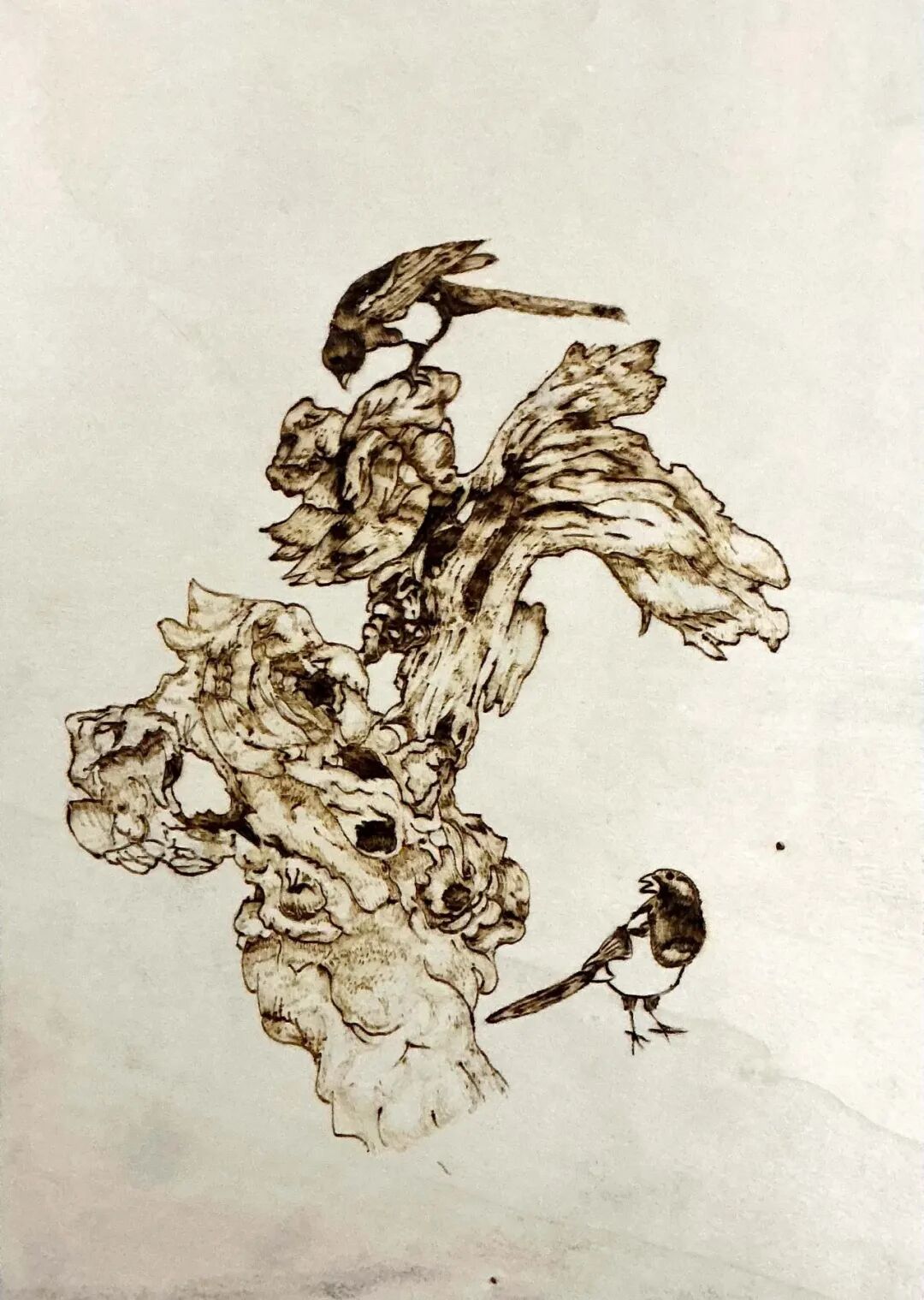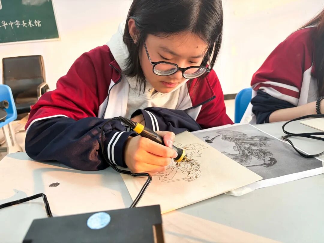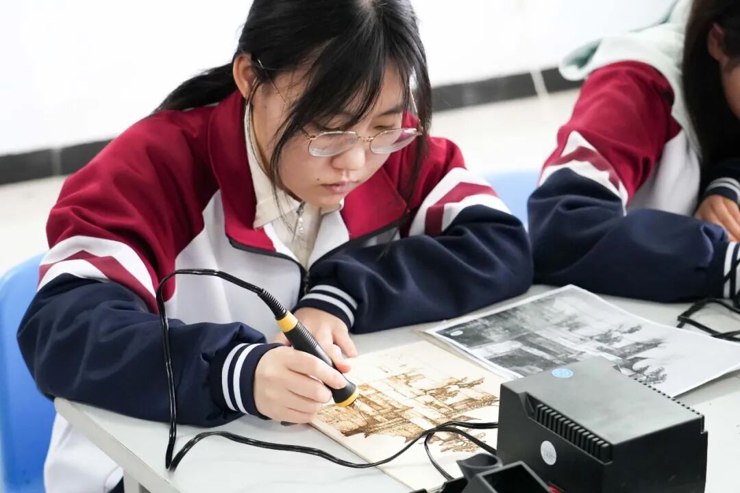 近年来,学校持续构建“大美育”体系,推动艺术教育从技能传授走向素养培育,从课堂延伸至生活。我校美术教师彭蕾老师将非遗烙画引入美术课程,让非遗传统文化变得更有生命力,而且更能被年轻人理解、运用和热爱。在她的指导下,学生作品既有古典气象,也有现代尝试。非遗传统文化,从一个模糊的概念,变成了可触、可感、可创造的鲜活体验。