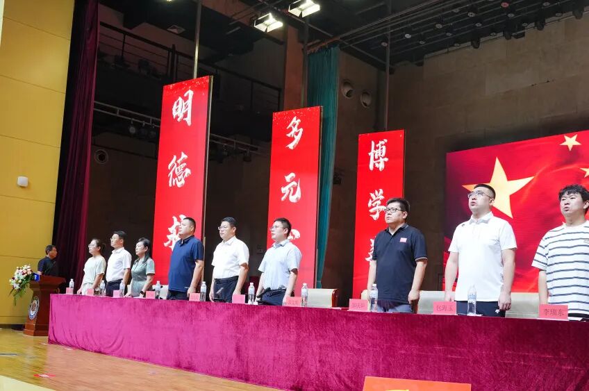 校长巩建英,党总支书记、副校长王伟,党总支副书记、副校长孙永峰,副校长张宪辉、李桂省、包海玉、郭庆炉、王丽昌,校长助理安国彩、李瑞东出席会议。大会由副校长张宪辉主持。会议在庄严的国歌声中拉开帷幕。全体与会人员肃立,向国旗行注目礼,雄壮的旋律激荡着每一位泰华教育人立德树人的初心与勇攀高峰的使命。