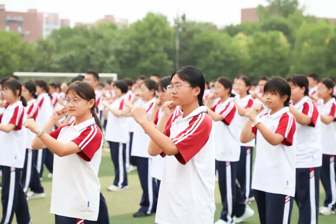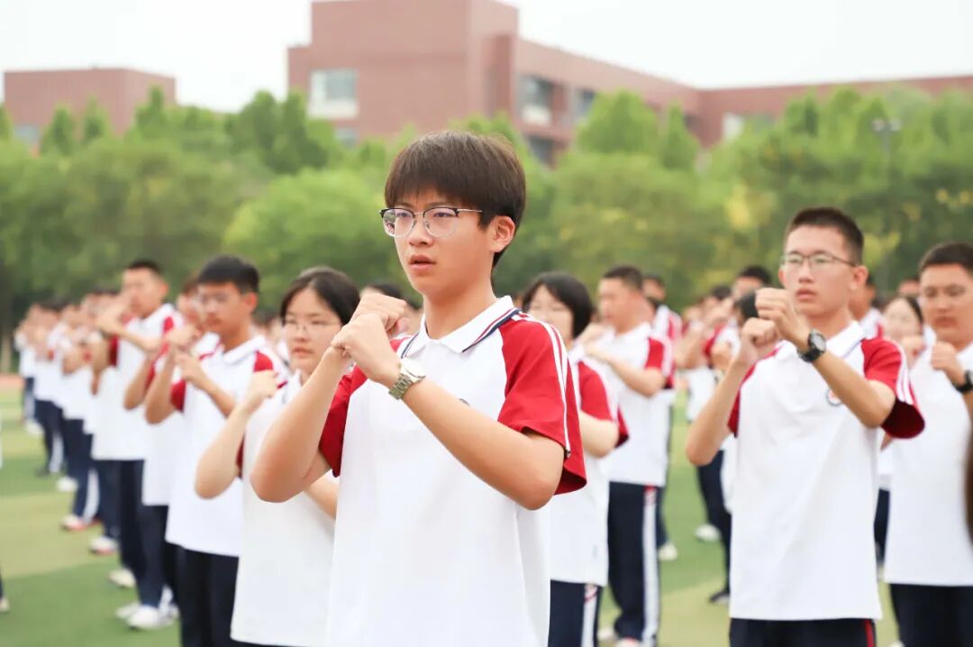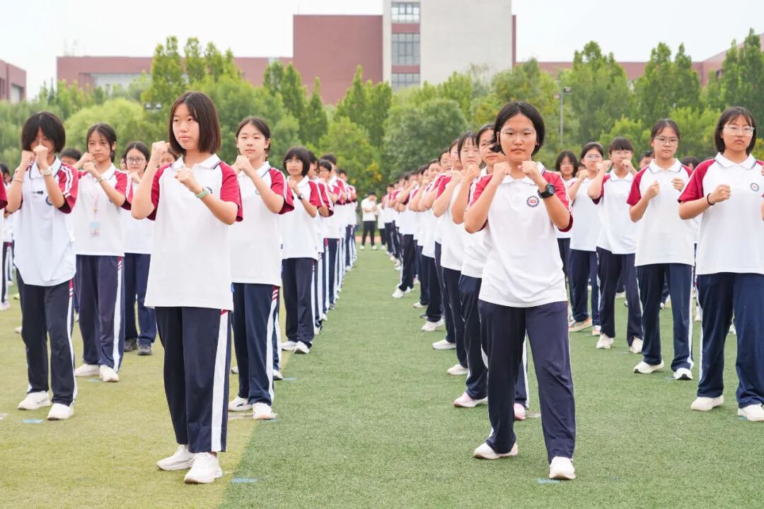 操场上,全体高一新生迎来了军训成果汇报展示。首先进行的是军体拳表演。同学们目光如炬,动作刚劲有力,一招一式尽显阳刚之气与青春力量,铿锵的口号声喊出了泰华学子的自信与豪迈。