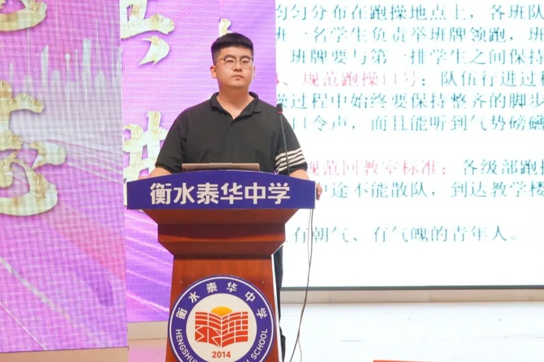 宋加琪主任从内务、纪律、卫生三个方面提出明确要求,通过引用阅兵视频影像和往届优秀学子实例,强化思想引领和榜样带动。他强调,规范月不仅是行为上的约束,更是责任与担当的锤炼。宋主任代表全体教师郑重承诺:将以严谨的教学态度托举学生的成才梦想,以细致的关怀点燃求知热情,并对迟到早退、作业敷衍、课堂散漫等现象坚决实行“零容忍”,做到及时提醒、耐心纠偏,用原则守护学风,用行动捍卫成长。