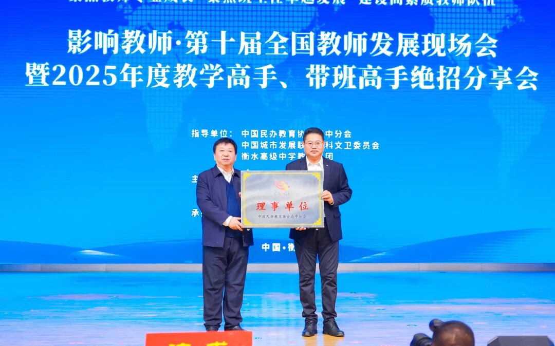 会议期间举行了庄重的授牌仪式。中国民办教育协会高中分会正式授予衡水泰华中学“理事单位”牌匾,朱建民常务副理事长授牌,巩建英校长接牌。这一荣誉既是对泰华中学办学成果的肯定,也体现了行业协会对学校未来发展的期许。