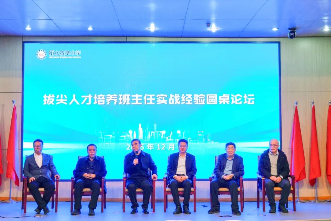 “拔尖人才培养班主任实战经验”圆桌论坛由郭建民理事主持,赵国忠院长、巩建英校长、陈广林老师、雷火军老师、朱海峰老师等各位实战专家围坐论道。