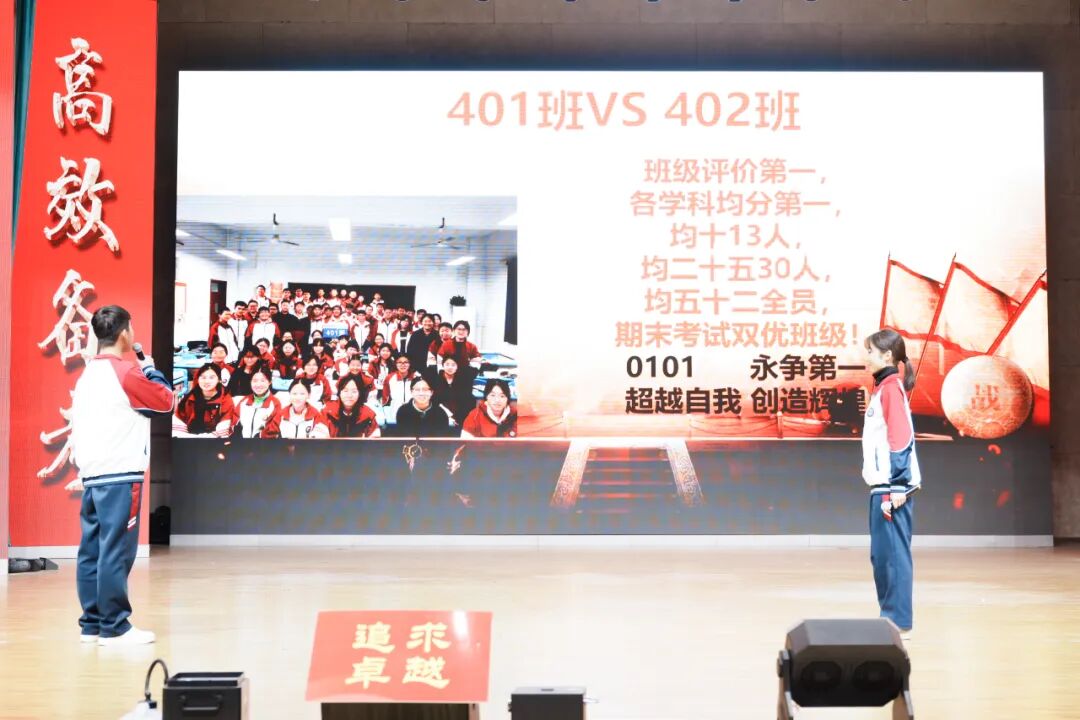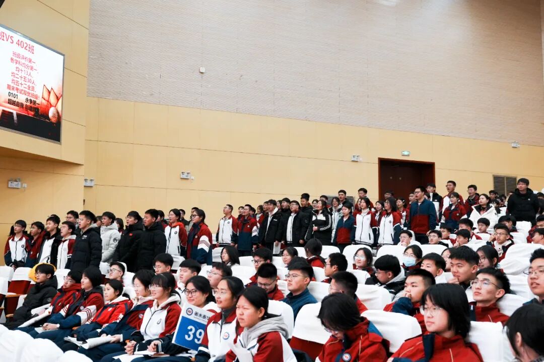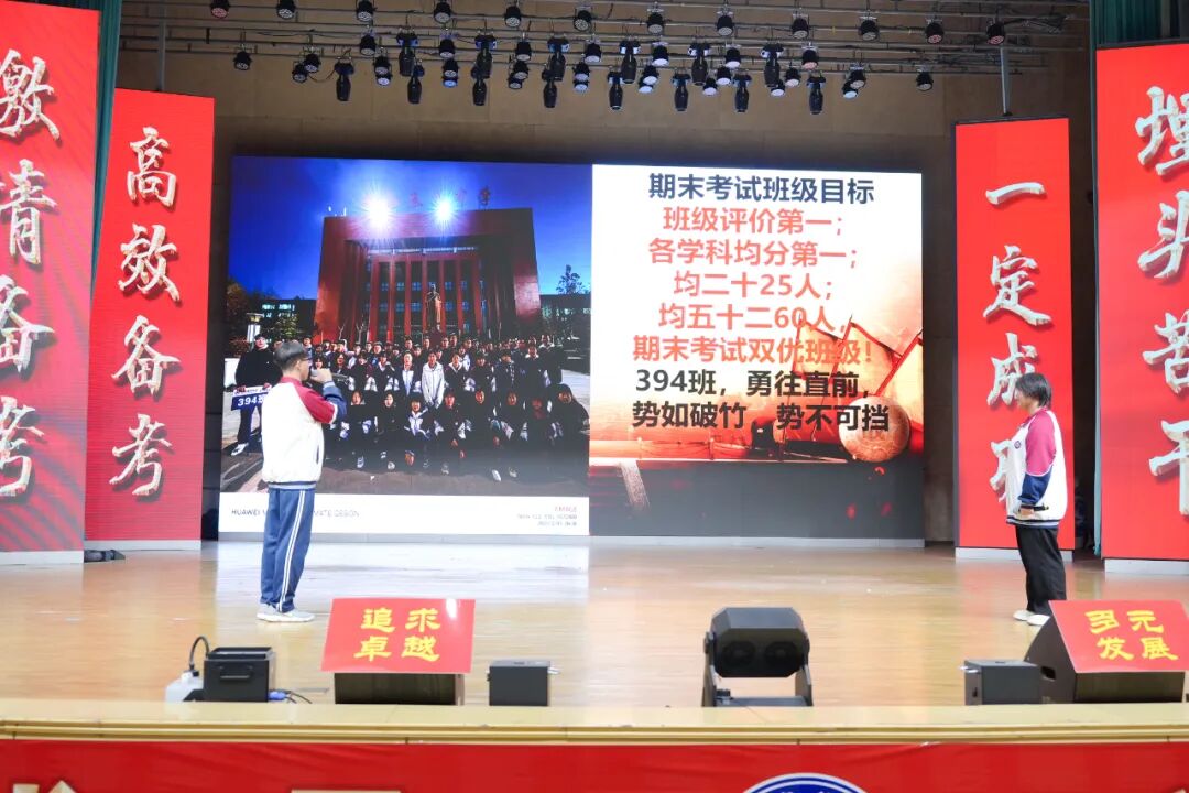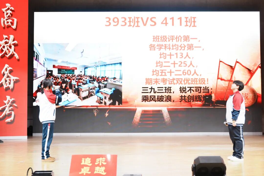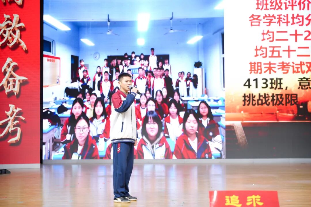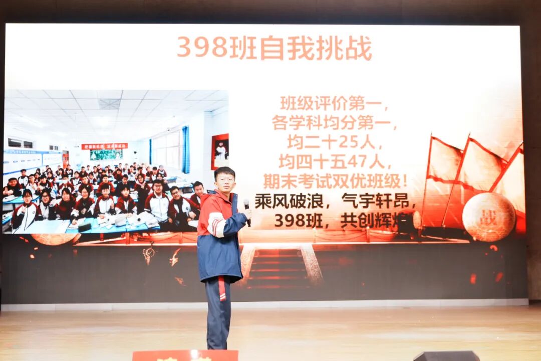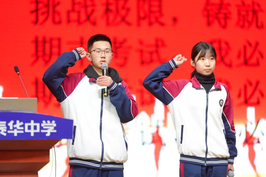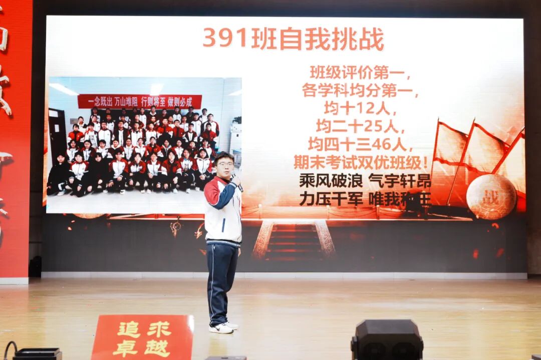 班级挑战宣誓环节将大会的气氛推向高潮,各班学子斗志昂扬、意气风发,以铿锵誓言展现青春锋芒。各班班长上台宣读挑战书,字字铿锵、豪情满怀,被挑战班级从容应战,展现出昂扬向上的精神风貌。各班同学依次起立,高举右拳,慷慨激昂的誓言响彻会场,字字铿锵、句句坚定,既展现了各班不服输、敢拼搏的精神风貌,更凝聚了全体学子携手奋进、共创佳绩的强大合力