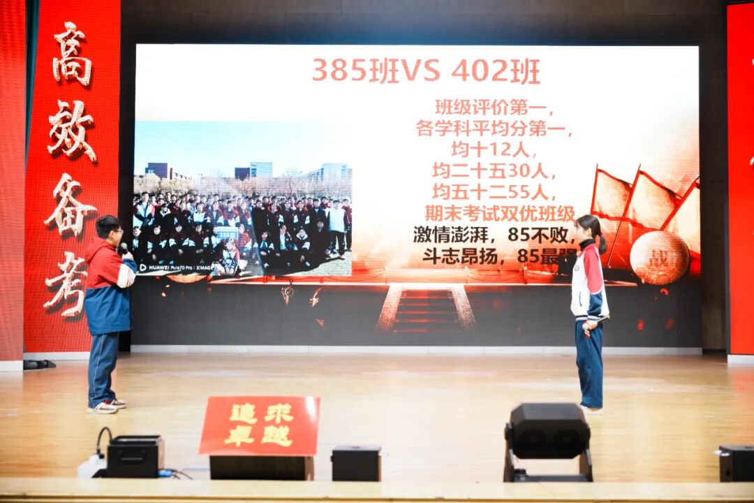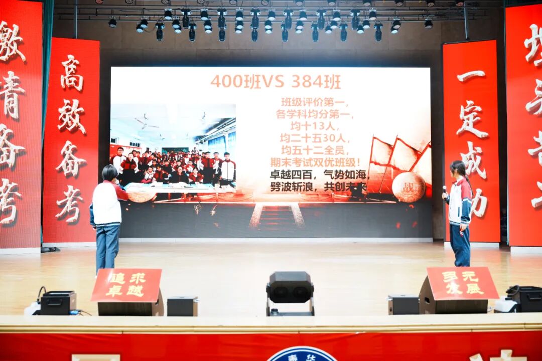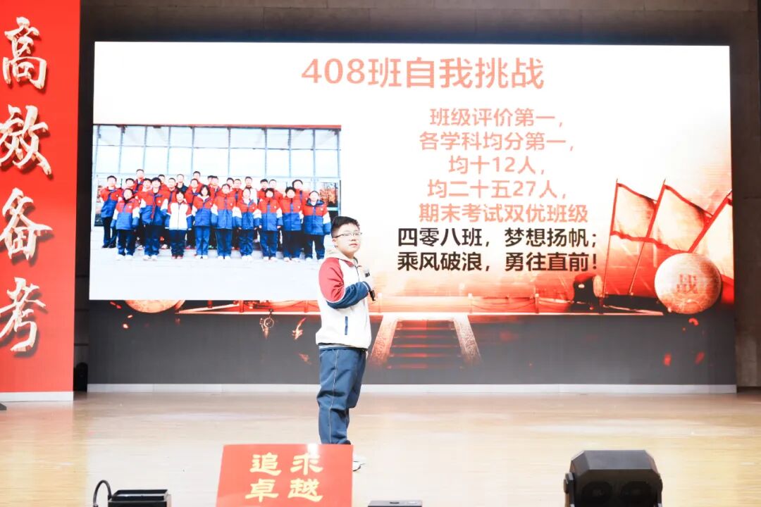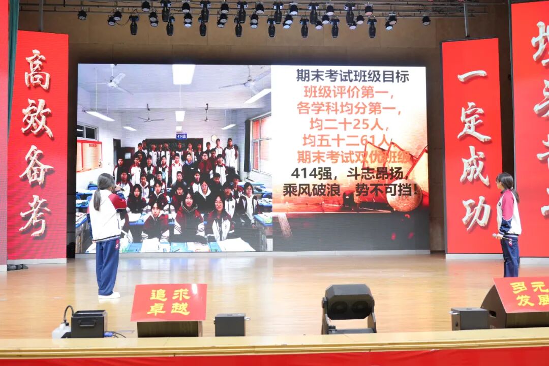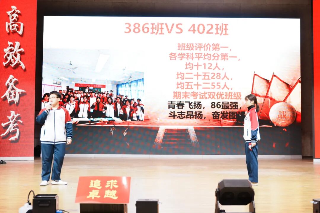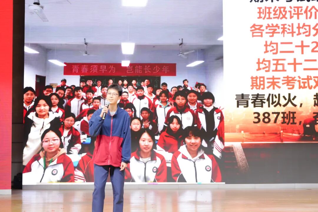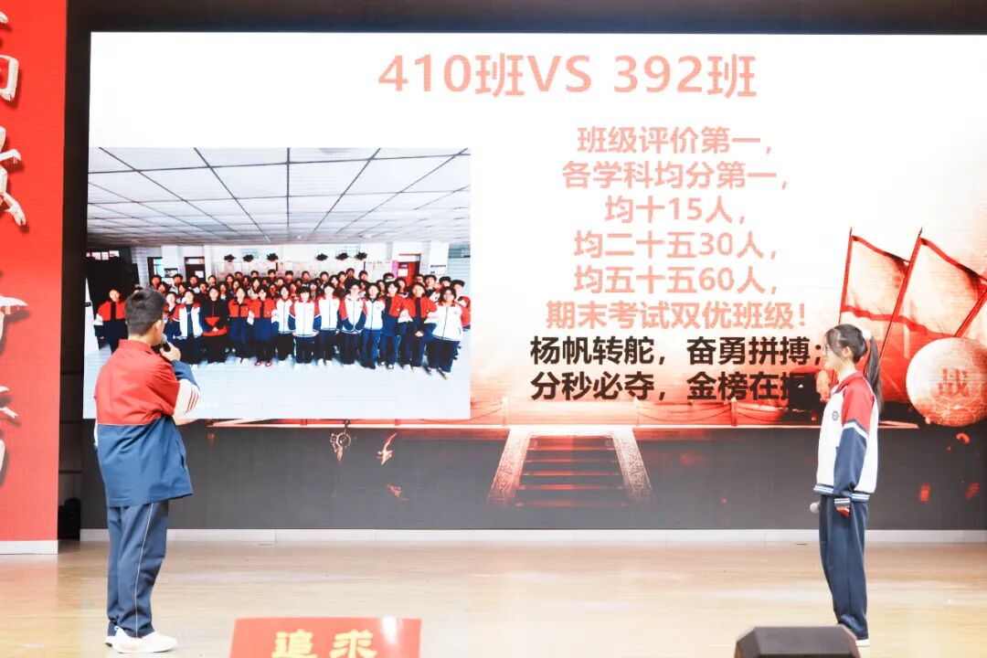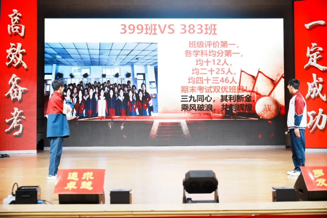 班级挑战宣誓环节将大会的气氛推向高潮,各班学子斗志昂扬、意气风发,以铿锵誓言展现青春锋芒。各班班长上台宣读挑战书,字字铿锵、豪情满怀,被挑战班级从容应战,展现出昂扬向上的精神风貌。各班同学依次起立,高举右拳,慷慨激昂的誓言响彻会场,字字铿锵、句句坚定,既展现了各班不服输、敢拼搏的精神风貌,更凝聚了全体学子携手奋进、共创佳绩的强大合力