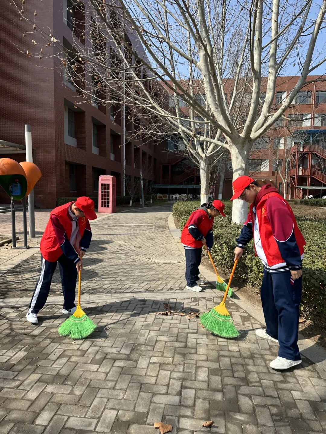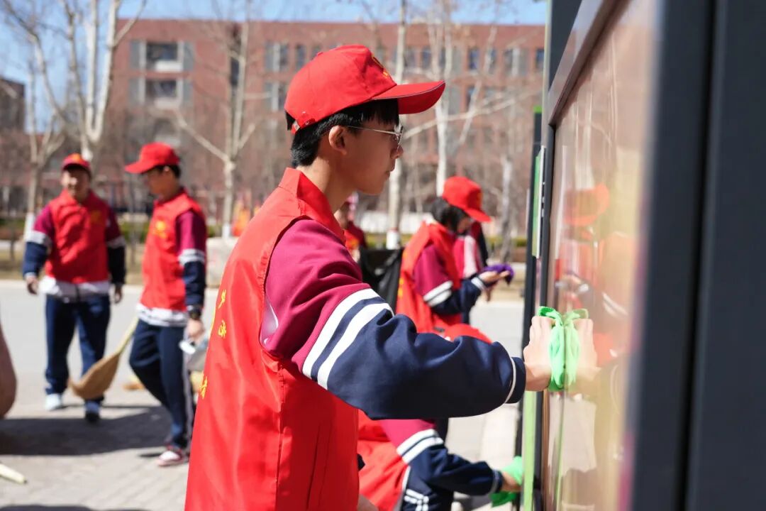 志愿者们身着统一服装,手持扫帚、抹布等工具,穿梭在教学楼走廊、校园主干道、绿化带及文化橱窗旁,细致清扫卫生死角、认真擦拭公共设施,不怕脏、不嫌累,用汗水擦亮校园颜值。