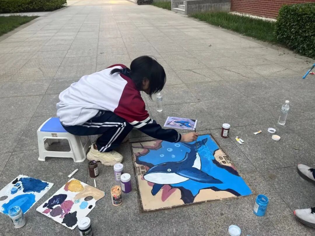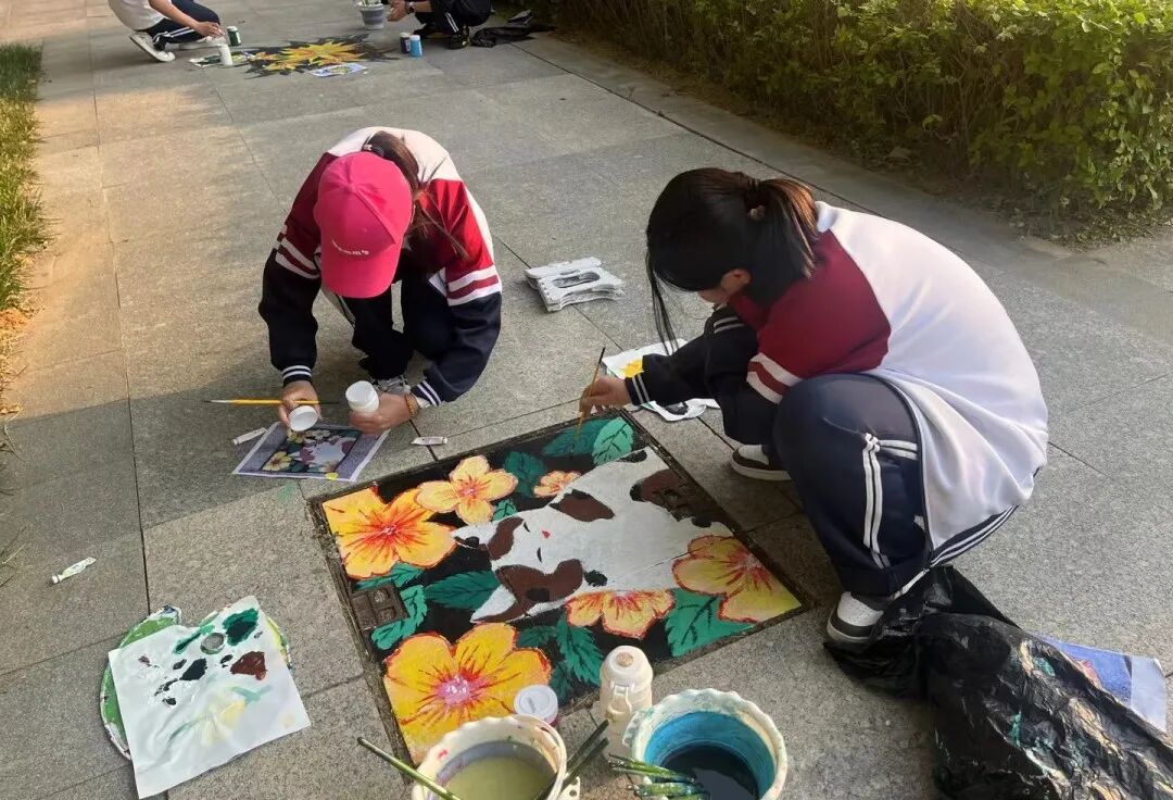 同学们手执画笔、匠心创作,将校园里单调的井盖化作缤纷的“微型画布”,灵动的图案、鲜艳的色彩点亮校园每一个角落,让普通的公共设施成为承载青春温度与志愿情怀的风景线。