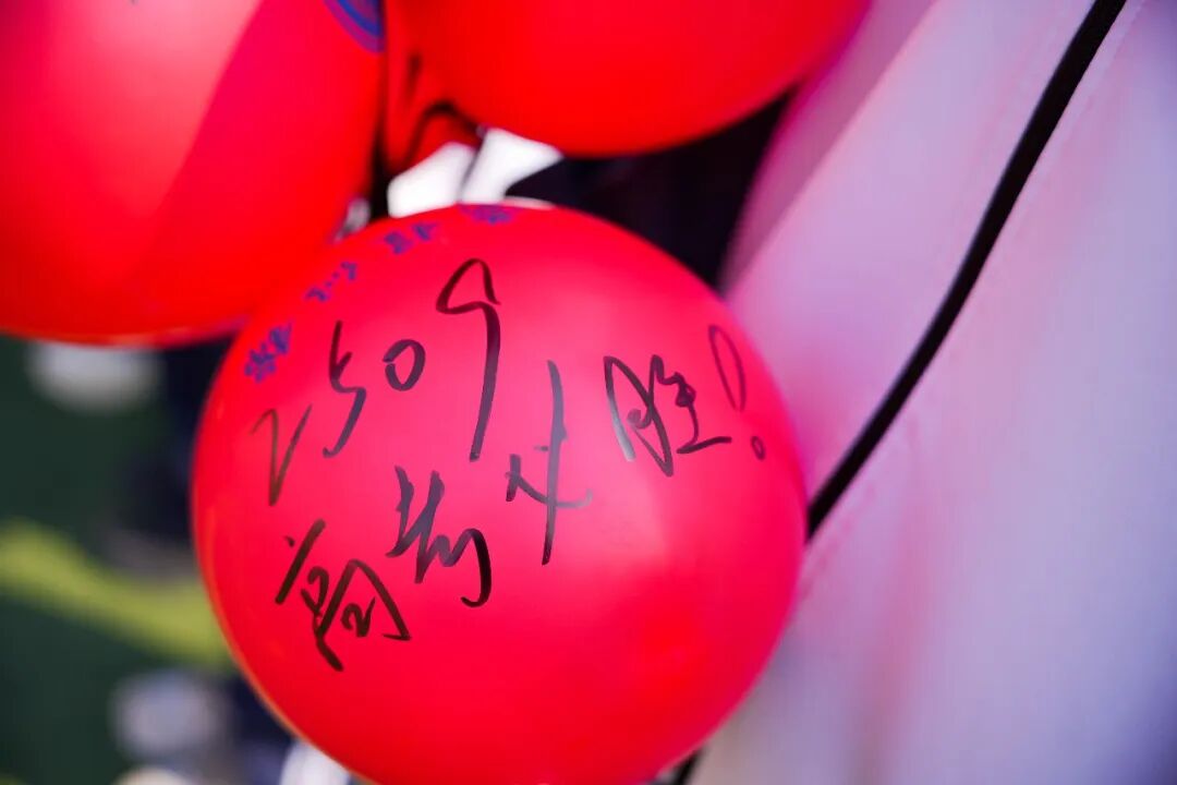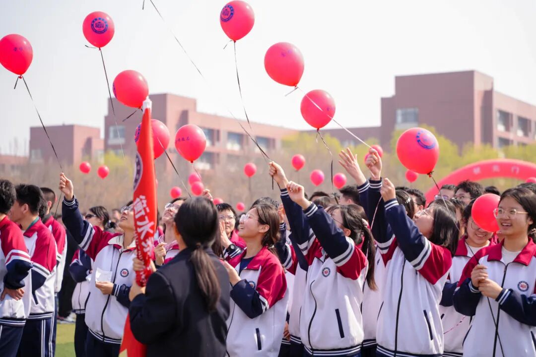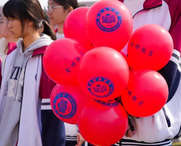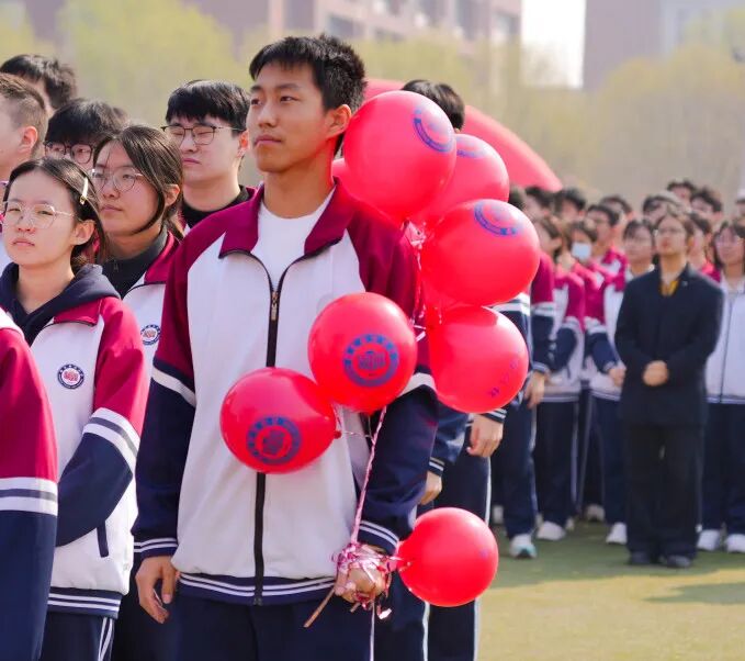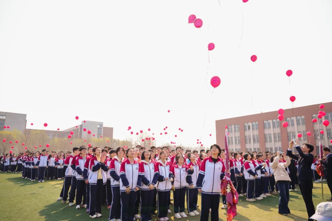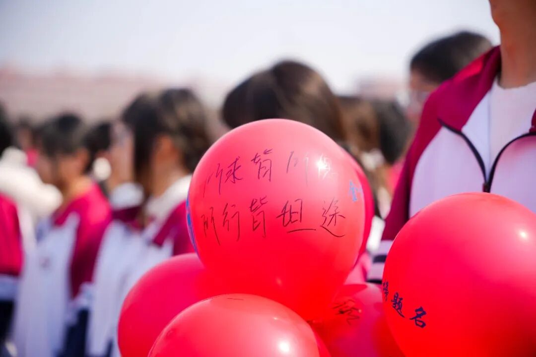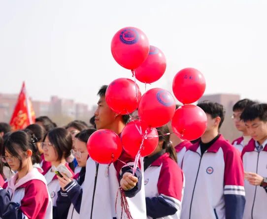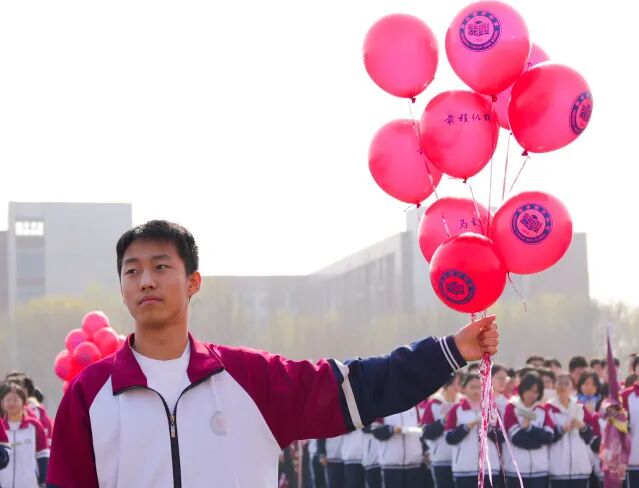 青春无敌,梦想缤纷。同学们手中握着系有期许的气球,五颜六色,汇聚成一片希望的海洋。