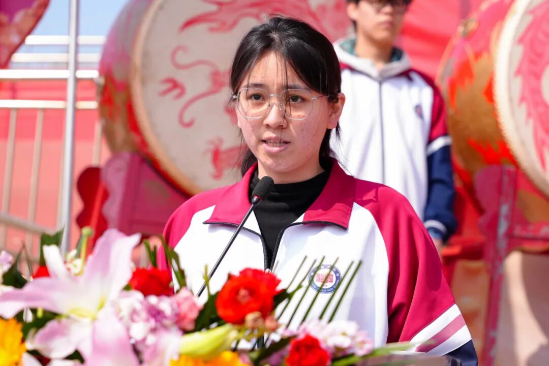 学生代表2532班王亚明同学登台,发出高考倒计时80天的青春倡议。她声音洪亮而坚定:“80天,是十二年寒窗的收官冲刺,分秒必争;80天,是青春逐梦的关键一跃,全力以赴!”字字句句,道出全体高三学子的心声。