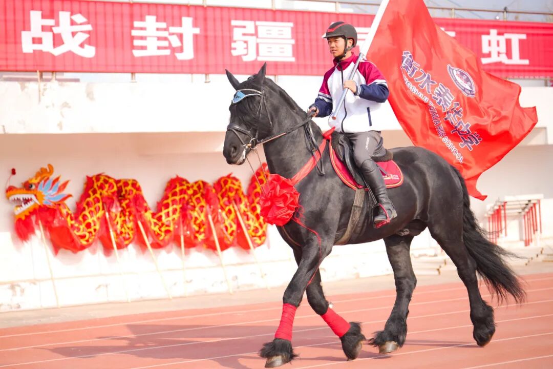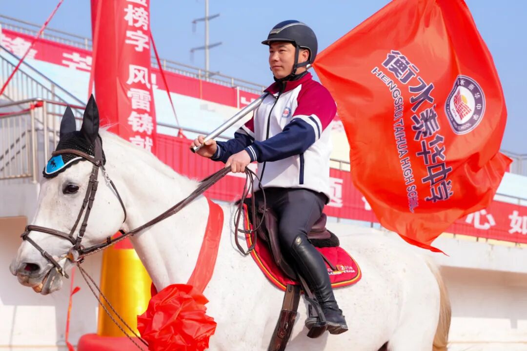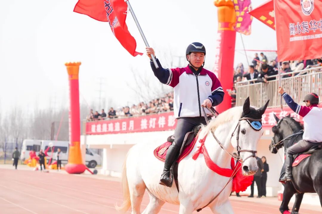 两位身着泰华中学校服的骑手高擎校旗,策马奔腾,绕场飞驰!马蹄声声,踏响的是青春无悔的节拍;校旗飘扬,指引的是逐梦前行的方向!