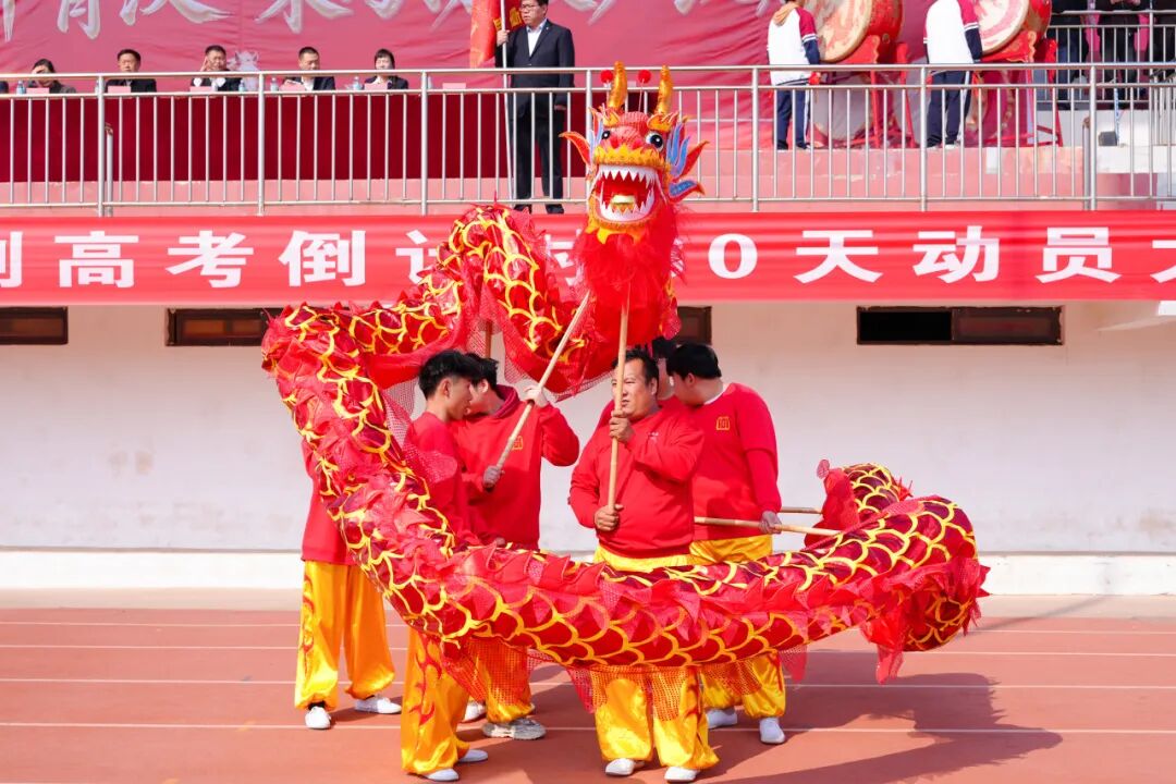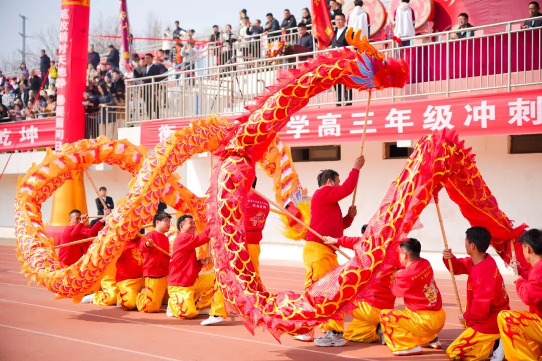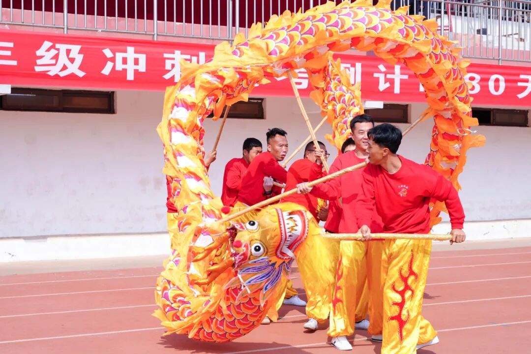 操场南北两侧,两条金色长龙呼啸而出!龙头高昂,龙身翻腾,龙尾摆动,在舞龙队员的默契配合下,两条巨龙盘旋飞舞,气势磅礴,威震四方!