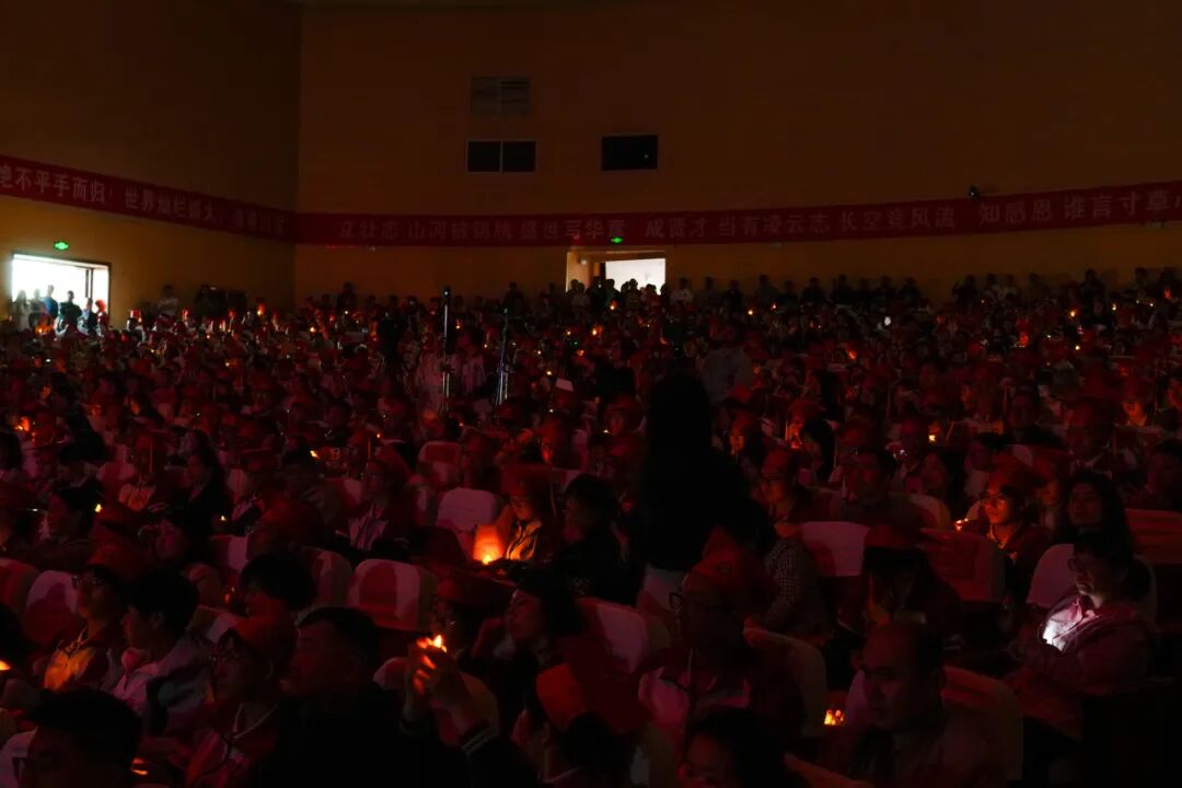 在全场的注视下,校领导与家长代表共同点燃十八支蜡烛。烛光摇曳,寄托希望。全场灯光缓缓熄灭,同学们点亮手中的手捧灯,点点星光汇聚成温暖璀璨的光海。大家双手合十,闭目静思,在心底默默许下十八岁最虔诚、最美好的愿望。